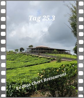 21.11. Traumwetter - wir fahren zum Le Morne noch ein paar Drehs nachholen. An der Südküste entlang geht es weiter. Wir fangen noch einige herrliche Stimmungen beim Landeplatz des Wasserflugzeuges ein. Ein würdiger Abschied vom Le Morne. Unser heutiges Zeil ist die älteste und größte Teefabrik auf Mauritius - Bois Cheri. Das Museum ist sehr nett und die Führung informativ. Zur Domäne gehört auch ein Restaurant auf einem Hügel gelegen. Es wurde uns recht empfohlen, also lassen wir uns auf Pizza mal ganz anders ein, eine mit geräuchertem Schwertfisch und Ananas und eine mit Vanillehühnchen, sehr überraschender Geschmack und super lecker. _________________________________